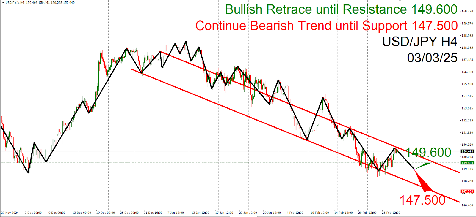 - Trading Outlook: If the price fails to break above 149.600, a downtrend toward 147.500 is likely. However, if it breaks above 149.600, a bullish reversal may begin.