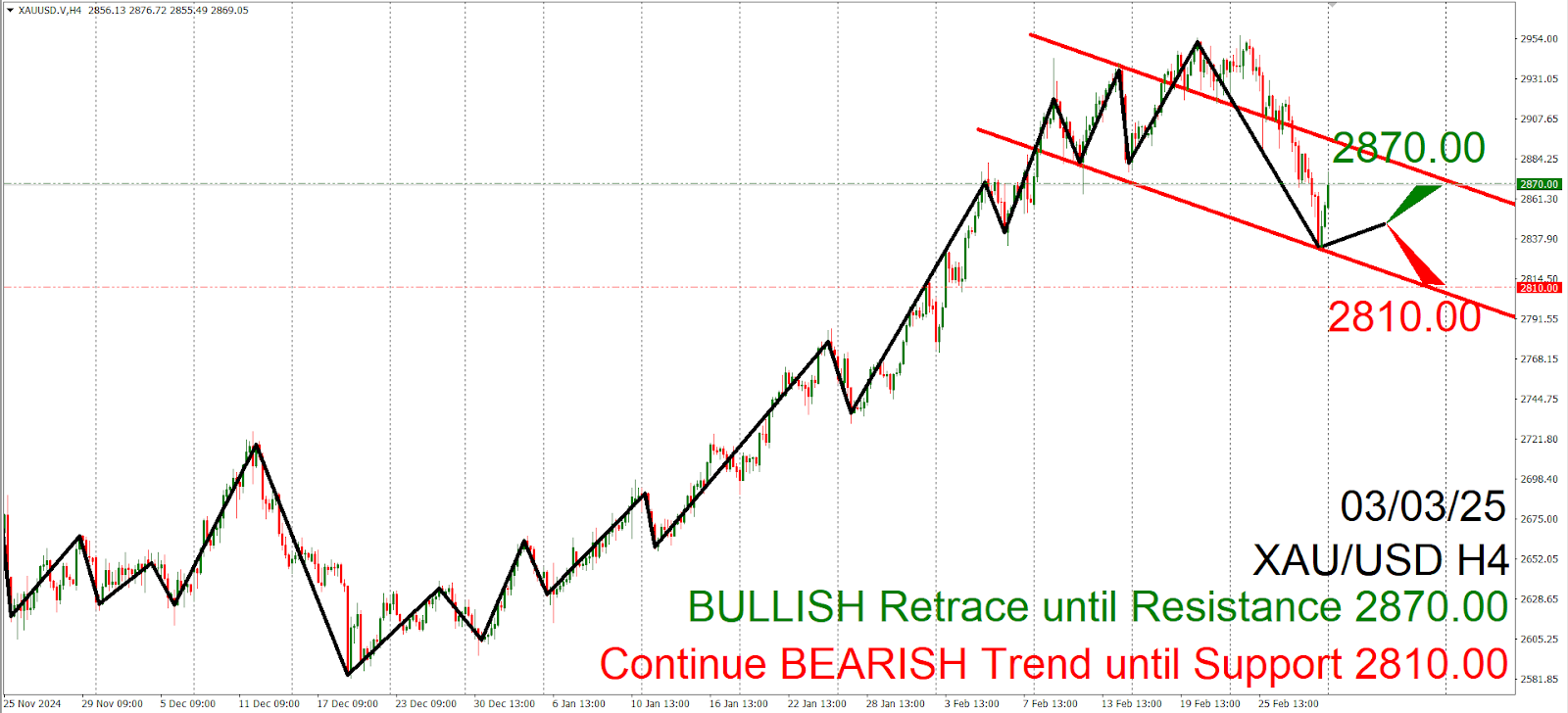 - Trading Outlook: If the price fails to break above 2870.00, the bearish trend will likely continue. A breakout above 2870.00 may indicate a bullish reversal.